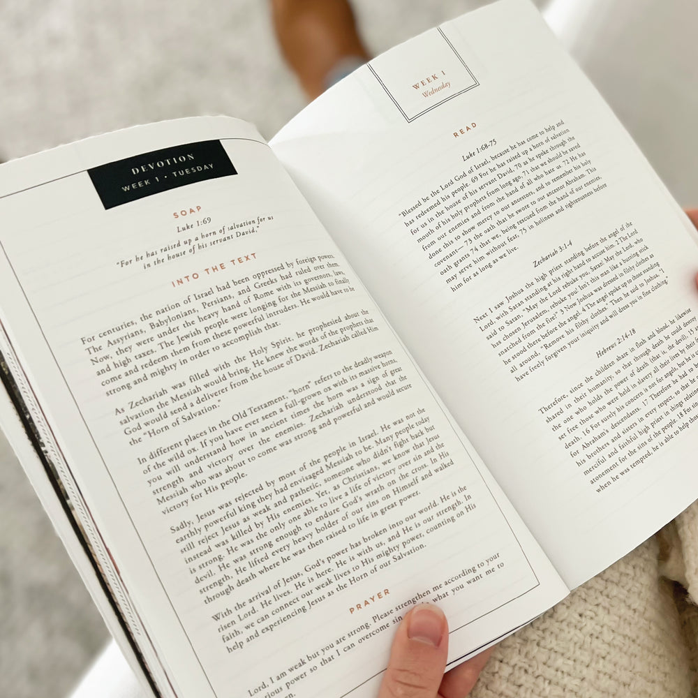 Rejoice is a four-week Bible study to discover the songs of Advent that express our joy at the birth of the long-awaited Messiah. This study journal includes a four-week reading plan, daily Scripture readings, SOAP journaling pages, daily devotionals, weekly challenges and reflection questions, global highlights, and more.